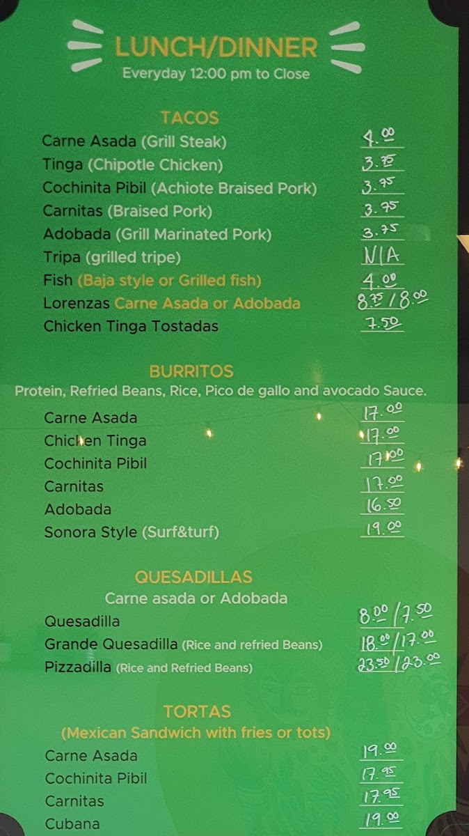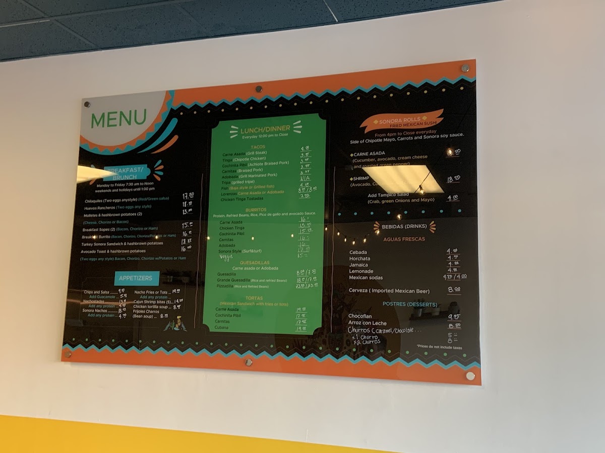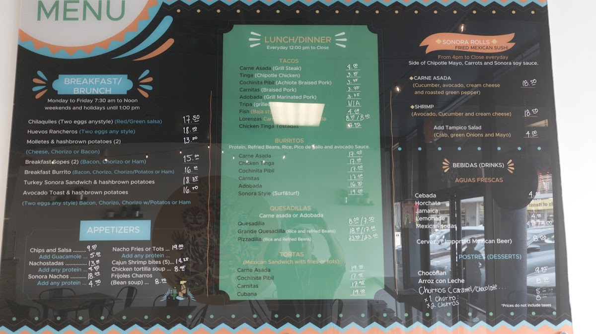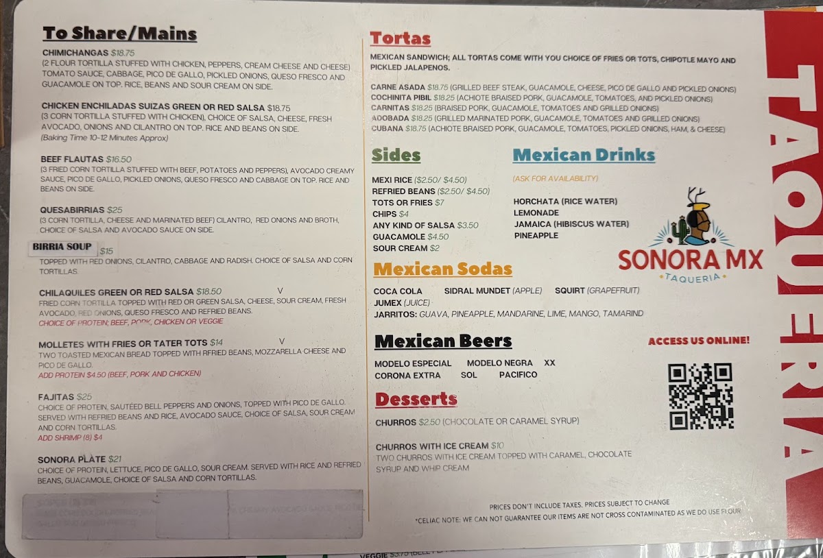 Sonora Mx Taqueria offers a vibrant and diverse menu that will satisfy any craving for authentic Mexican flavors. For appetizers, you can enjoy Loaded Fries or Loaded Tots, both perfect for sharing, or dive into the comforting Chicken Tortilla Soup. The Steak Fajitas and Cajun Chicken Fajitas provide a sizzle with bold spices, while the Quesabirrias (3) and Adobada Fajitas are flavorful options for those seeking something unique. For a lighter touch, the Green Chilaquiles with your choice of protein, such as Steak or Cochinita, is a delicious choice. If you’re in the mood for tacos, you can opt for the Tinga Taco, Adobada Taco, or Carnitas Taco, with each taco offering its own distinct taste. The Lorenzas Adobada Taco is a standout with its tostada base. Burrito lovers will delight in the Adobada Burrito, Sonora Style (Surf and Turf) Burrito, or the comforting Carne Asada Burrito. The Carne Asada Torta and Cochinita Pibil Torta are perfect choices for a hearty sandwich, while the Veggie Quesadilla and Cheese Quesadilla offer milder options. Pair any dish with a refreshing drink like a Mexican Coke, Jarritos Lime, or a sweet Horchata. Don’t forget to indulge in a warm Churro, available in either Caramel or Chocolate, for the perfect finish to your meal. With a variety of flavorful options, Sonora Mx Taqueria truly brings the taste of Mexico to Delta, BC.